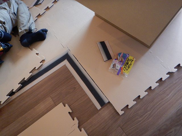 玄関部分から居間の方を見ると、防音マットの仕上がりはこんな感じになります。このAS防音マットとテーパ材の上には、絨緞(カーペット)用両面テープ(厚手)を使いますが、フローリング部分はこのままで、タイルカーペットの裏に付いている吸着材で固定されます。