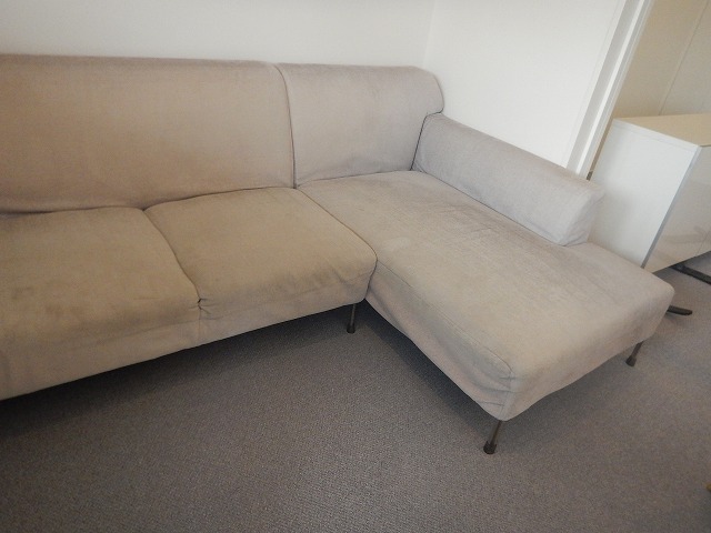 ソファーのある部分の仕上り状況です。ソファーの脚の下にはAS強力マットを入れてありますが、一般の人には場所の特定が難しい場合がありますので、その時は、一度ソファーなどを配置して1週間ほど置き、跡がタイルカーペットに付いてから、再度入れ直す方法もあります。